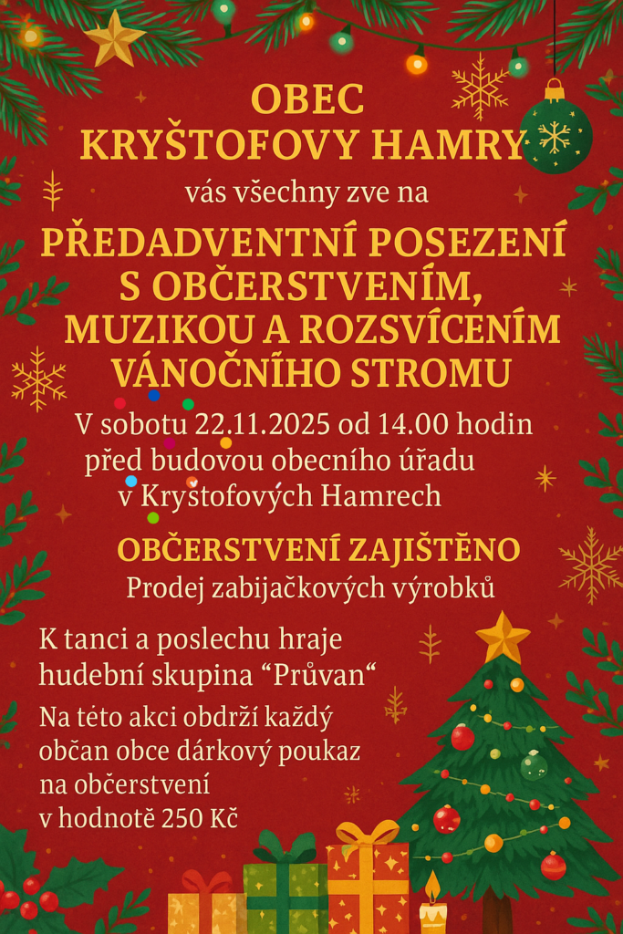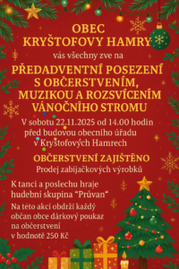 Předadventní posezení s občersvením, muzikou a rozsvícením vánočního stromu proběhne v sobotu 22.11.2025 od 14.00 hodin před budovou obecního úřadu v Kryštofových Hamrech. Občerstvení je zajištěno, k prodeji zabijačkové výrobky. K tanci  a poslechu hraje hudební skupina Průvan. Vánoční strom rozsvítíme po 17.00 hodině.