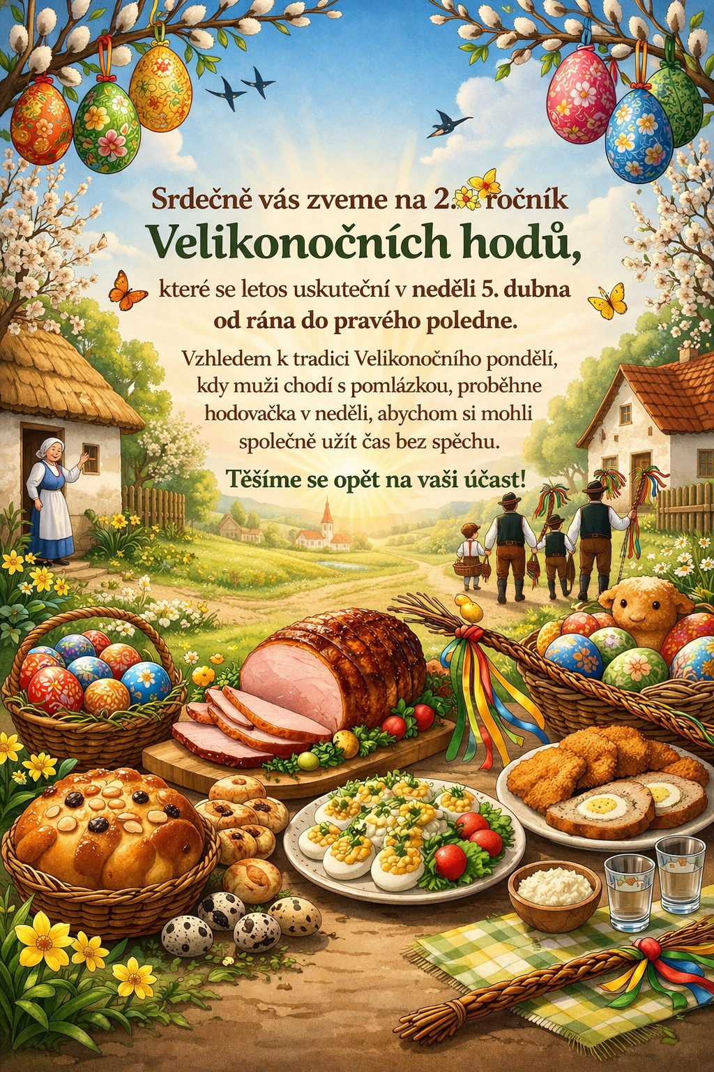 srdečně vás zveme na 2. ročník Velikonočních hodů, které se letos uskuteční v neděli 5. dubna od rána do pravého poledne. Vzhledem k tradici Velikonočního pondělí, kdy muži chodí s pomlázkou, proběhne hodovačka v neděli, abychom si mohli společně užít čas bez spěchu.